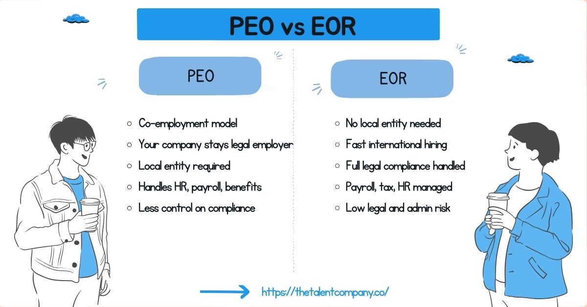 PEO VS EOR is one of the most important hiring decisions businesses face when expanding domestically or globally. It is an important business decision that affects your growth, risk management, spending, and scalability. For many US companies, hiring across borders has become a necessity, not a choice. But the moment a company decides to hire internationally, serious questions come up. Who is the legal employer? Who handles payroll, taxes, labor laws, and terminations? And how do you manage all of this without spending months? This is where PEO (Professional Employer Organization) and EOR (Employer of Record) come in. Both models are designed to simplify hiring. Both offer compliance support. Choosing the wrong option can lead to legal risk, higher costs, and operational complications. This guide explains the real differences between PEO and EOR. Read on to understand how each model works, where they are best used & which option makes the most sense for your growth plan. What is an Employer of Record (EOR)? An Employer of Record is a third-party service that legally employs workers on behalf of another company. While the employee works full-time under the client company’s direction, the EOR assumes full legal responsibility for the candidate’s employment. This model is widely used by companies that want to hire talent domestically or internationally without establishing a local legal entity. The EOR becomes the official employer, handling all employment-related legal and administrative obligations, while the client focuses on managing the employee’s day-to-day work. In practical terms, an EOR allows companies to access global talent quickly, compliantly, and with minimal operational overhead. Key Responsibilities of an EOR An EOR is responsible for every legal and regulatory aspect of employment. This includes: Legal Employment and Contracts: The EOR issues locally compliant employment contracts in accordance with country-specific labor laws. This ensures the correct classification of workers and reduces the risk of penalties for misclassification. Payroll Management: The EOR processes payroll, ensures accurate wage calculations, manages deductions, and guarantees timely salary payments in local currency. Tax Withholding and Reporting: All employee taxes are calculated, withheld, and submitted correctly by the EOR. This includes income tax, social contributions, and statutory deductions mandated by law. Labor Law Compliance: The EOR stays up to date with local employment regulations, including working hours, overtime rules, termination laws, and employee protections. Benefits Administration: Statutory and optional benefits such as health insurance, paid leave, and retirement contributions are managed by the EOR in line with local requirements. Termination and Offboarding: Employee terminations are handled compliantly, including notice periods, severance obligations, and documentation. When to Use an EOR An EOR is the right solution when speed, flexibility, and certainty of compliance matter. Common Use Cases for an EOR: Hiring international employees without setting up a local entity Expanding into new markets quickly Testing new geographies before long-term investment Managing remote or distributed teams across countries Reducing legal exposure to foreign labor laws For fast-growing companies, startups, and enterprises alike, EORs remove the traditional barriers to global hiring. What is a Professional Employer Organization (PEO)? A Professional Employer Organization (PEO) works through a co-employment arrangement, where both the PEO and the client company share employer responsibilities. The PEO handles HR-related tasks, including payroll processing, benefits administration, and compliance requirements. At the same time, the client company remains responsible for hiring decisions, day-to-day supervision, and overall employee management. In this model, employees are legally connected to both the PEO and the client company. The PEO manages HR operations and helps ensure regulatory compliance, while the client company focuses on running the business and directing the employees’ daily work. Key Responsibilities of a PEO A PEO shares employment responsibilities with the client company and manages core HR and administrative functions. Payroll Processing: The PEO manages payroll operations, including salary calculations, wage distribution, and payroll reporting. This helps ensure employees are paid accurately and on time. Benefits Administration: PEO handles employee benefits, including health insurance, retirement plans, and various other benefit programs. They assist with enrollment, changes, and ongoing administration. HR Services and Employee Support: PEO offers a full range of HR services, which may include employee onboarding, policy management, performance support, and employee training programs to help businesses develop and retain talent. Compliance Support and Regulatory Guidance: The PEO provides guidance on employment laws and regulatory requirements. While it helps manage compliance, legal responsibility is shared, and the client company remains partially liable. Workers’ Compensation and Unemployment Claims: PEO manages workers’ compensation coverage and assists with unemployment insurance claims, helping businesses reduce administrative burden and manage employment-related risks more effectively. Shared Employment Liability: Under the co-employment arrangement, both the PEO and the client company share certain legal responsibilities related to employment, including HR compliance and workplace policies. When to Use a PEO A PEO is appropriate when a company already has established operations in a specific country. A PEO is a good fit when: Your company already has a legal entity in the country where employees are hired. You want to outsource HR functions such as payroll, benefits, and compliance to reduce administrative workload. You prefer to retain full control over